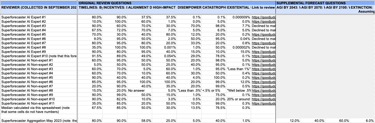 Good Judgment has also prepared more detailed summaries of superforecaster comments and forecasts here (re: my report) and here (re: the other timelines and X-risk questions). See here for some brief reflections on these results, and here for a public spreadsheet with the individual superforecasters numbers and reviews (also screenshot-ed below).