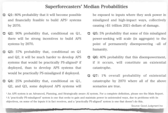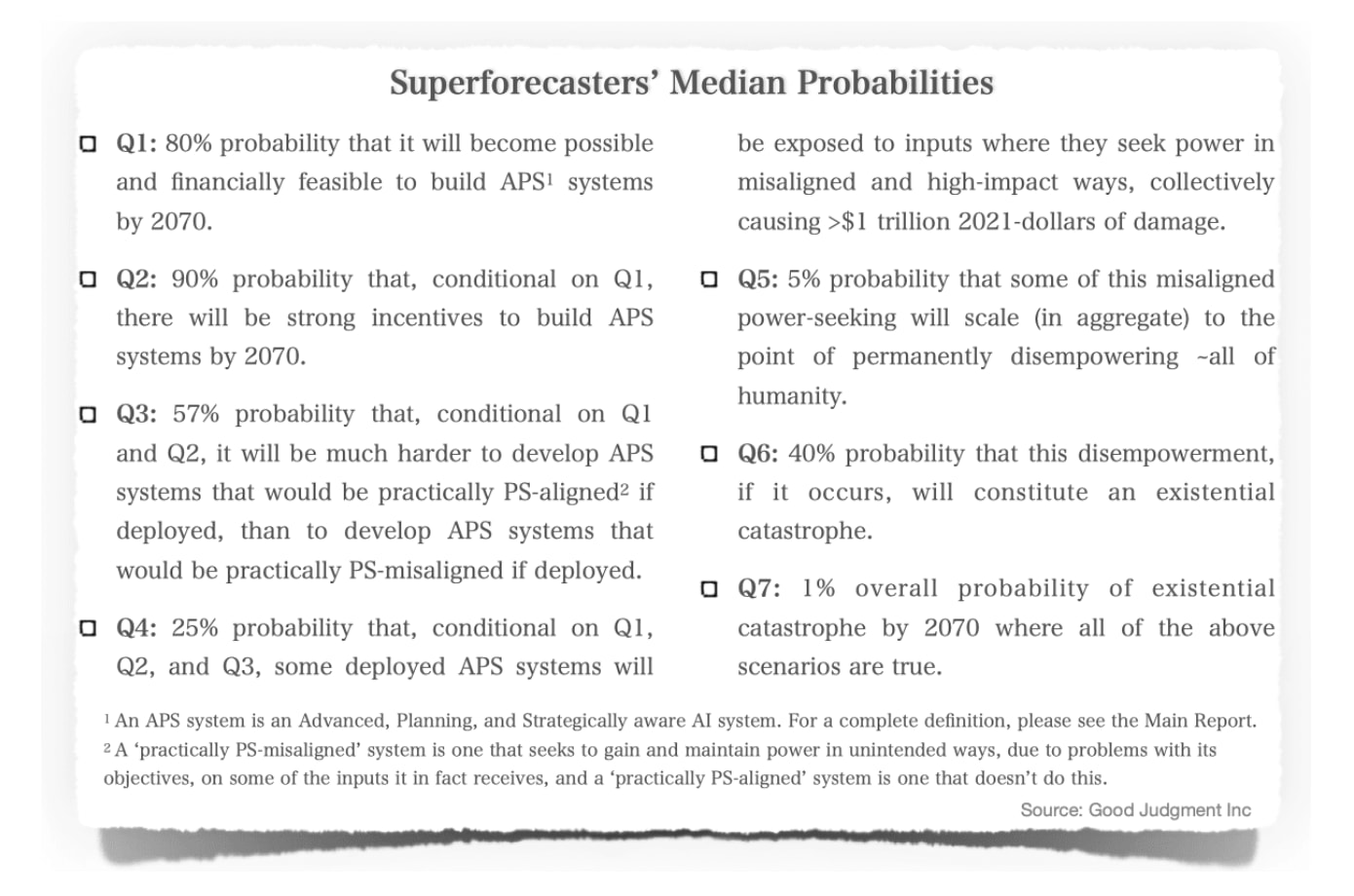 Added 10/18/23: With funding from Open Philanthropy, Good Judgment also solicited reviews and forecasts from 21 superforecasters regarding the report -- see here for a summary of the results. These superforecasters completed a survey very similar to the one completed by the other reviewers, except with an additional question (see footnote) about the "multiple stage fallacy."[1] Their aggregated medians were: