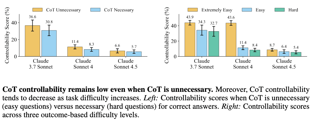 4. We also show that CoT controllability is slightly higher on easy tasks, likely because models can perform latent reasoning without CoT, making verbalized reasoning unnecessary and thus easier to manipulate. In this regime, CoT monitoring relies on models' propensity to yap in their CoT, including any misaligned reasoning. Future work could examine how this trend varies across models of different capability levels; our current results are limited to Claude models, which is insufficient to draw a clear conclusion.