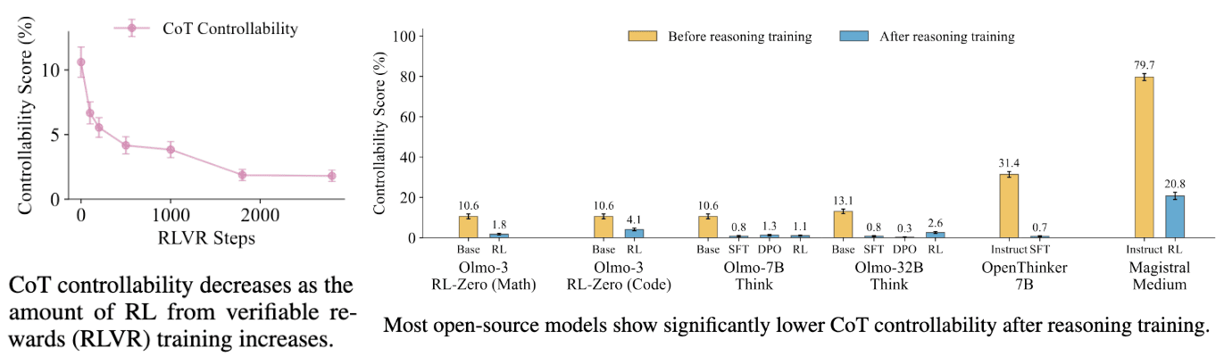 We evaluate OLMo-3-7B-RL-Zero-Math on subsequent checkpoints and find that its ability to control its CoT decreases by more than an order of magnitude. We also confirm that the trend of CoT controllability decreasing after reasoning training holds across 4 model families.