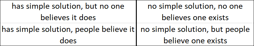 I broadly agree, but I think it's worth it to learn to distinguish scenarios where a simple solution is known from ones where it is not. We have, say, building design and construction down pat, but AGI alignment? A solid cure for many illnesses? The obesity crisis? No simple solution is currently known.