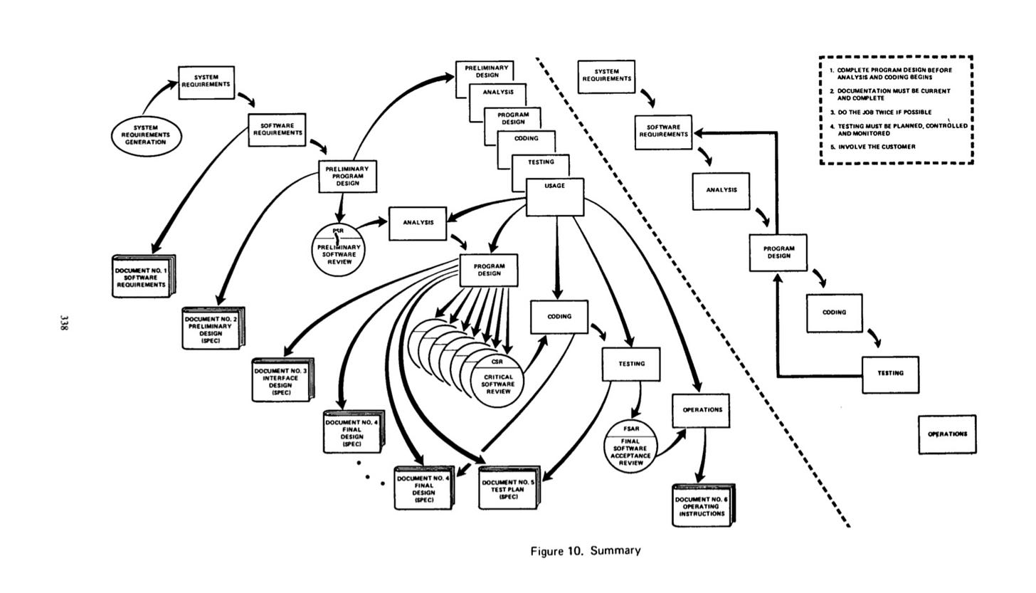 Figure 10, his summary diagram, looks nothing like the clean staircase of Figure 2. It is dense, looping, recursive. Preliminary designs feed back into requirements. Analysis cycles back into software requirements. There are parallel documentation streams, customer involvement checkpoints, iterative refinement loops at every stage. The arrows don’t just descend; they return, reconnect, spiral. It looks less like a waterfall and more like the nervous system of an organism that learns from contact with reality.