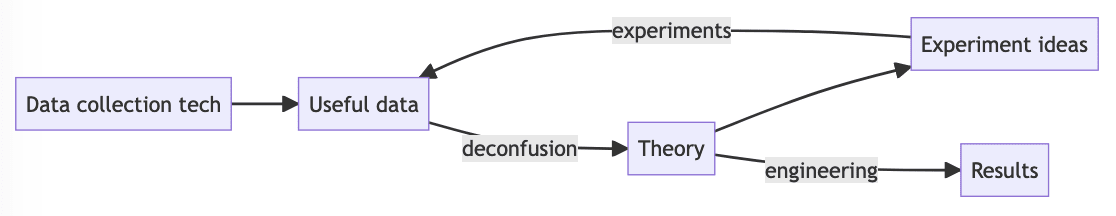 Note that I distinguish deconfusion (what you can invest in) from theory (the output). At any time, there are various returns to investing in data collection tech, experiments, and deconfusion, and returns diminish with the amount invested. I claim that in both physics and biology, we went through an early phase where the bottleneck was theory and returns to deconfusion were high, and currently the fields are relatively mature, such that the bottlenecks have shifted to experiment and engineering, but with theory still playing a role.