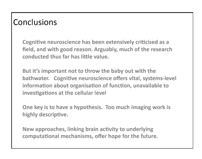 I remember the introductory lecture for the Cognitive Neuroscience course I took at Oxford. I won't mention the professor's name, because he's got his own lab and is all senior and stuff, and might not want his blunt view to be public -- but his take was "this field is 95% nonsense. I'll try to talk about the 5% that isn't". Here's a lecture slide: