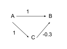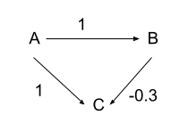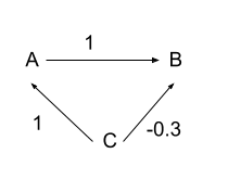 Now, if we regressed B onto A and C, we would get a coefficient of 1 for A and a coefficient of -0.3 for C, the true relationship. But just regressing B onto A gives us a coefficient for A of 0.7 because a unit increase in A causes a one unit increase in B but then it also causes a 1 unit increase in C which decreases B by 0.3, netting us 0.7. So our estimate of the true relationship between B and A is biased by omitting C. This is Omitted Variable Bias.