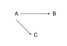 The letters in a DAG represent variables we are studying. In this case, A, B, and C. The lines represent paths of causality in the direction they are pointing. So here, changes in A cause changes in both B and C. An absence of a line represents the fact that there is no causal pathway between two variables. Changing B will not change C or vice versa. Also, the lines don’t run backwards, so changing either B or C exogenously will not change A.