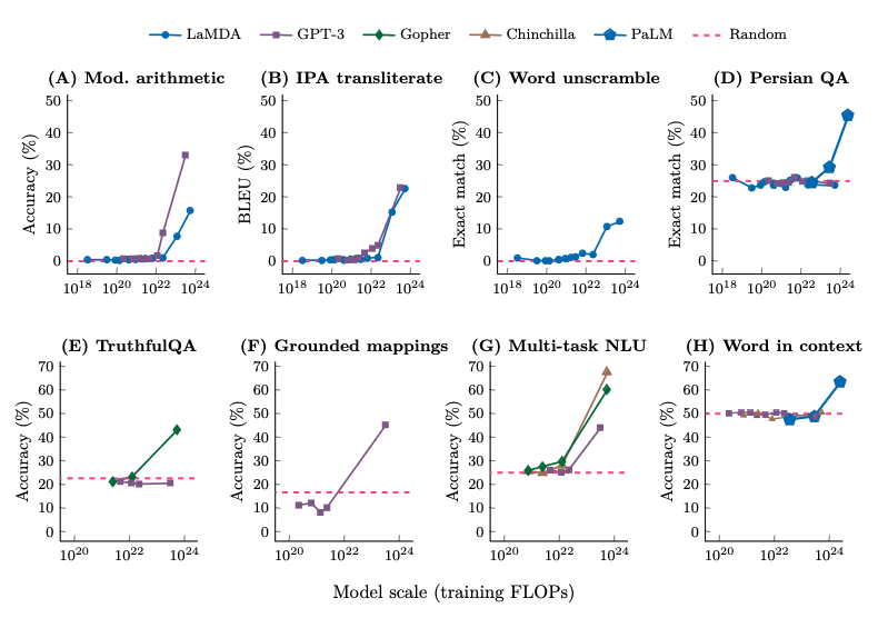 Wei et al. defines "emergent ability" like so: "An ability is emergent if it is not present in smaller models but is present in larger models." So you can have sudden "jumps" in performance on various tasks as you scale models up, e.g. (from Wei et al.):