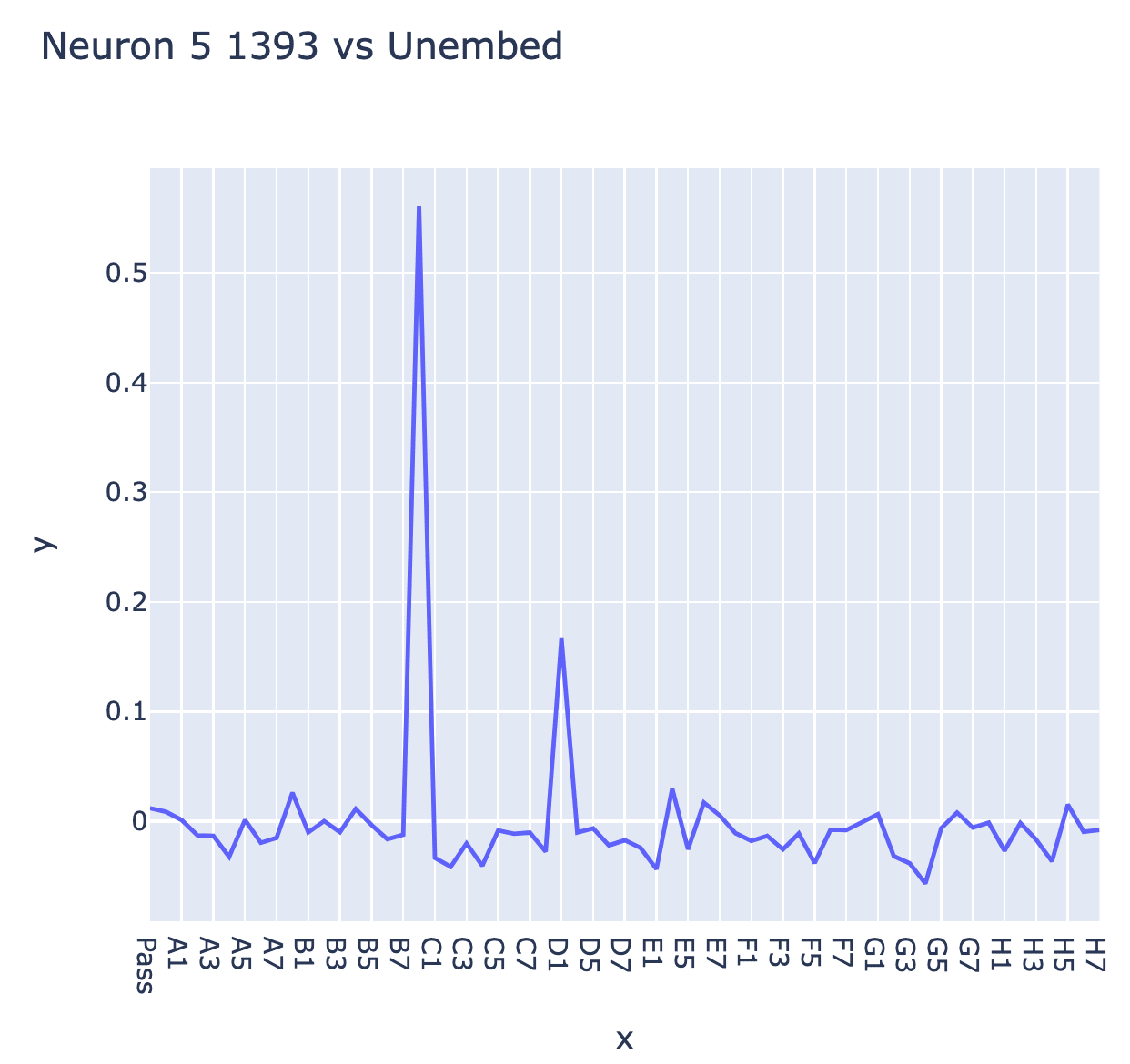 My guess from this and probe based analysis earlier was that neuron L5N1393 monosemantically represented the diagonal line configuration C0==BLANK & D1==THEIR'S & E2==MINE. This makes sense as a useful configuration since it says that C0 is a legal move, because it and E2 flank D1! But this seems inconsistent with the direct logit attribution of the neuron (ie the output vector of the neuron projected by the unembed onto the output logits), which seems to boost C0 a lot but also D1 a bit - which seems wildly inconsistent with it firing on D1 being their colour (and thus not a legal place to play!)
