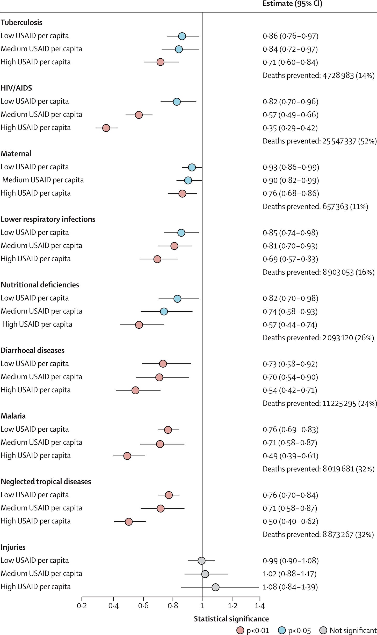 So each dot is a regression coefficient corresponding to a rate ratio. For example, the first row implies “Low USAID per capita spend is estimated to decrease Tuberculosis mortality by 100 - 86 = 14%, and that result is significant at the p < 0.05 level”. The striking sixth row implies “High USAID per capita spend is estimated to decrease HIV mortality by 100 - 35 = 65%, and that result is significant at the p < 0.01 level”.