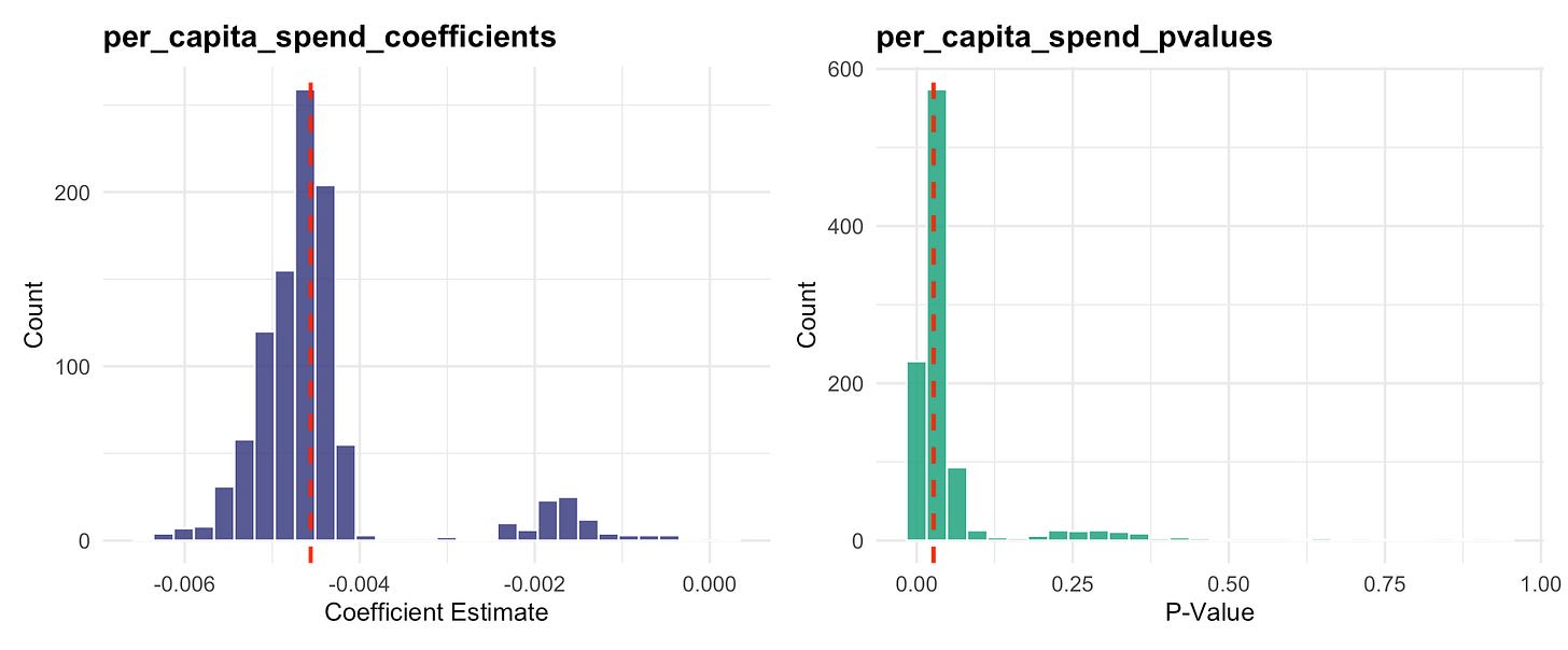 The red lines are the coefficient and p-value from Regression 1. I couldn’t check the exact 133 countries the author’s used (I only ended up with 129, which was probably because we bucketed the income levels slightly differently) but there’s nothing egregious here. It is interesting that when you drop the correct set of countries in these regressions, the spend effects basically go to zero, but this doesn’t happen very often.