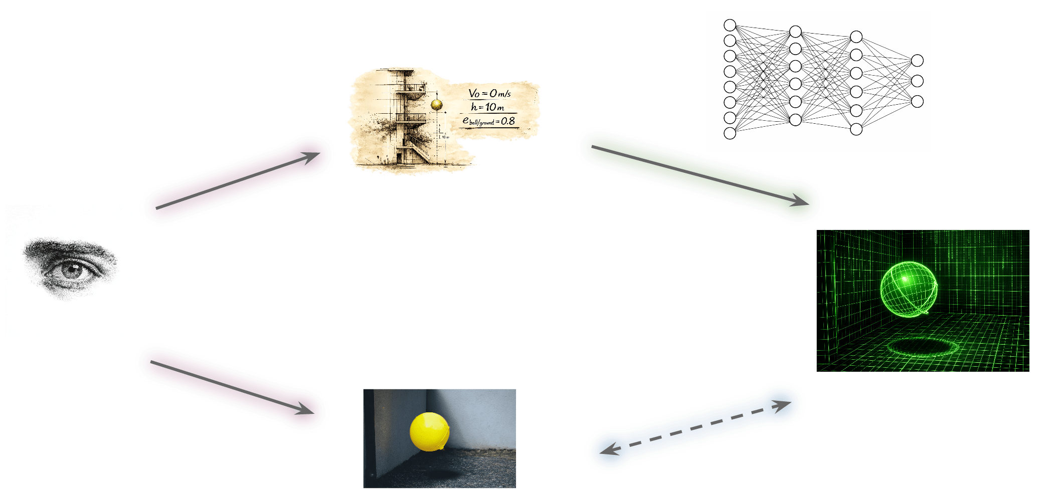 Looking back at our running example, if we want to engineer a way to make the ball even more bouncy, we have no intuition for how to do so. We would like to map our target neural network onto a mental model (a computational abstraction, a set of equations, an algorithm, ...) that empowers us to control it.