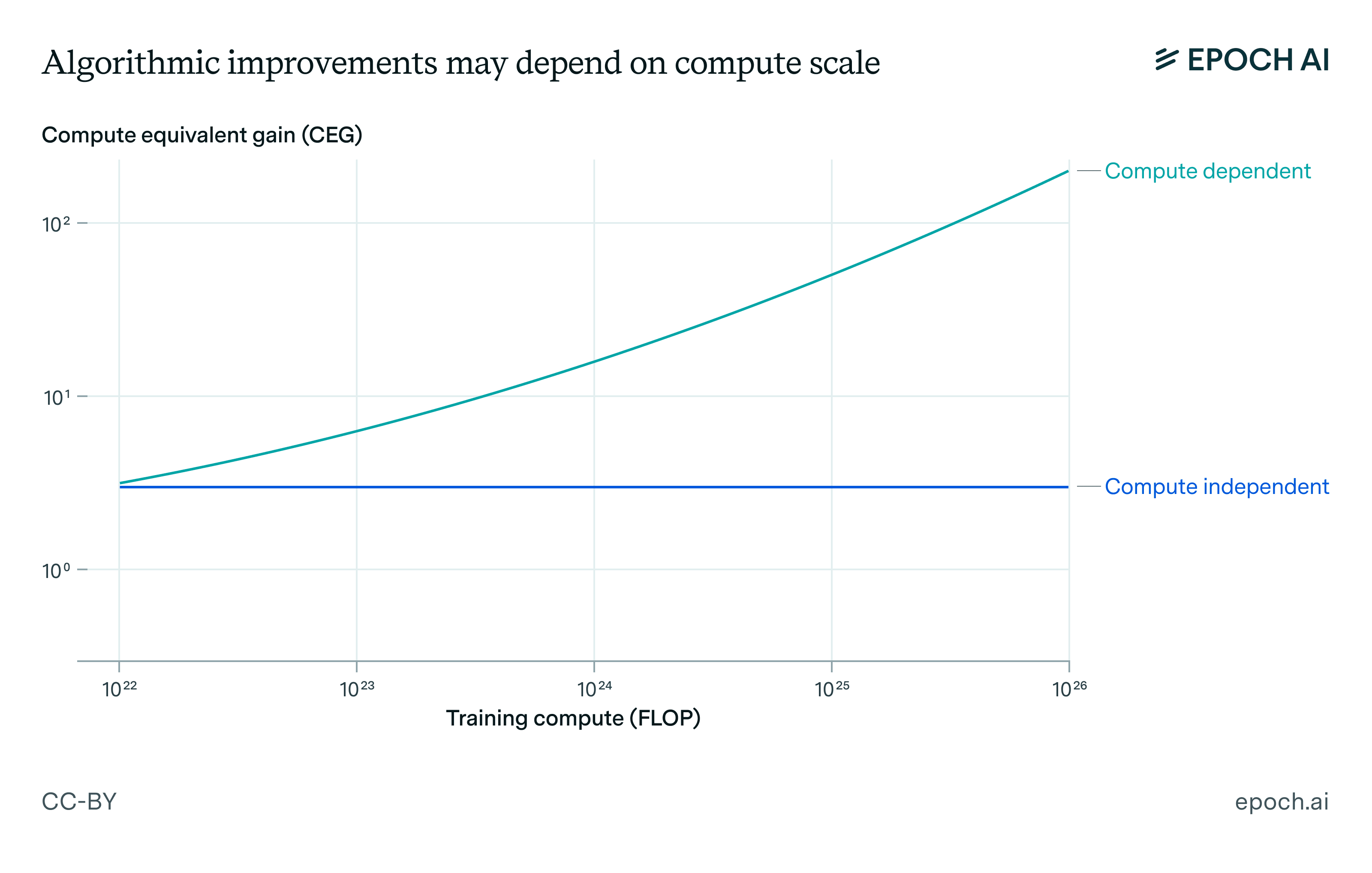 Algorithmic progress interacts significantly with compute scale. While compute-independent advances offer a path for progress even with hardware constraints, the largest historical gains have come from compute-dependent innovations requiring substantial scale to develop and validate. Understanding this distinction is crucial for designing effective governance and forecasting AI progress — based on our experiments, we expect that the rate of progress will depend on how easily labs can find and validate compute-dependent algorithmic advances.