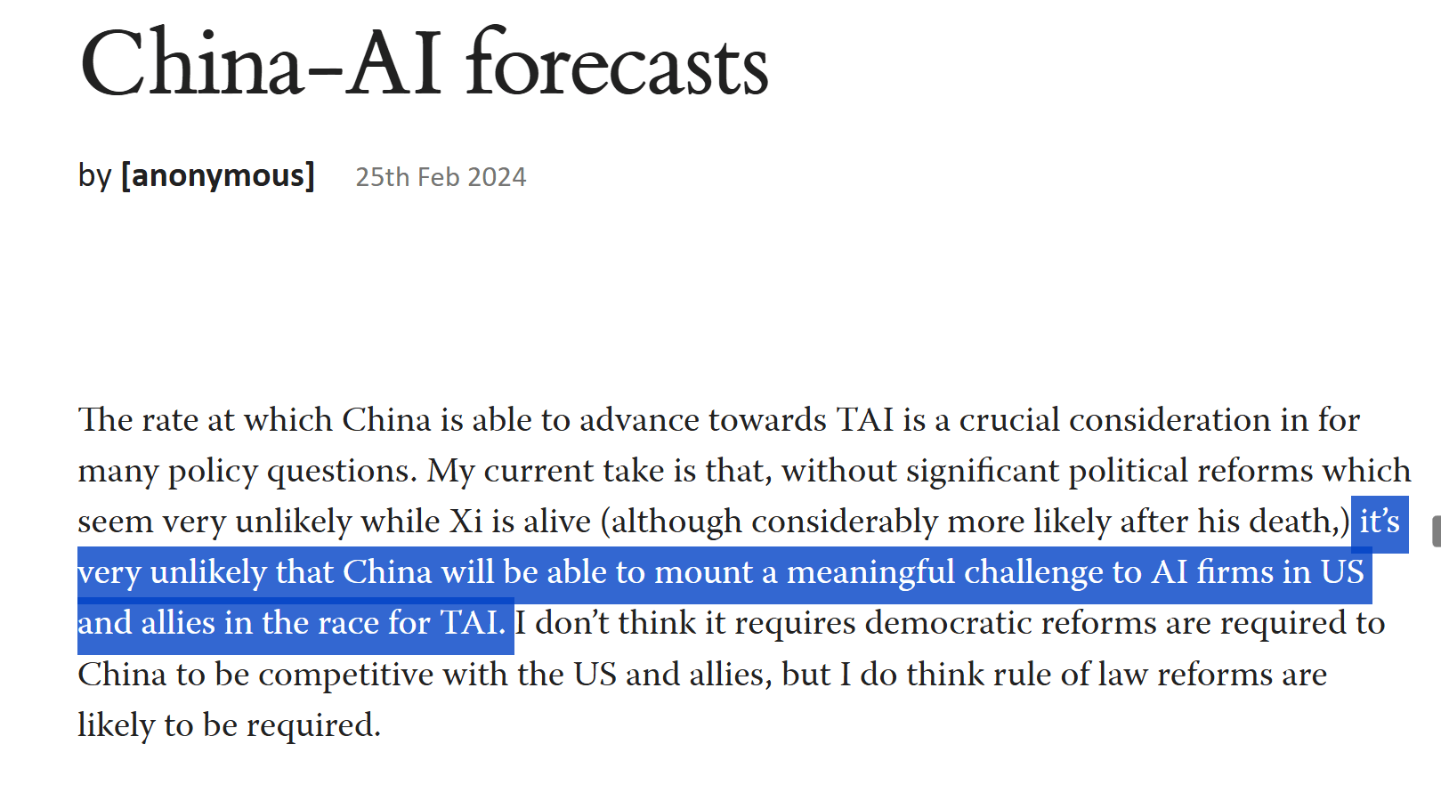 Both of these premises are unambiguously true as far as I'm aware. So, these predictions being bad suggests that we now believe China is likely to build AGI without realizing it threatens stability/control, and with minimal compute, before USA? All while refusing to agree to any sort of deal to slow down? Why? Seems unlikely.