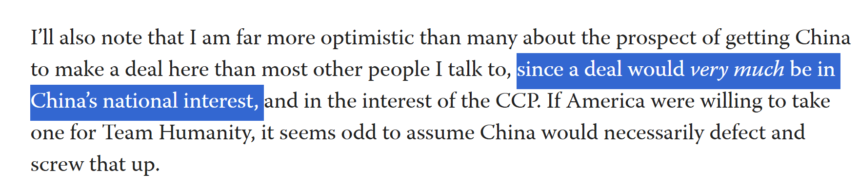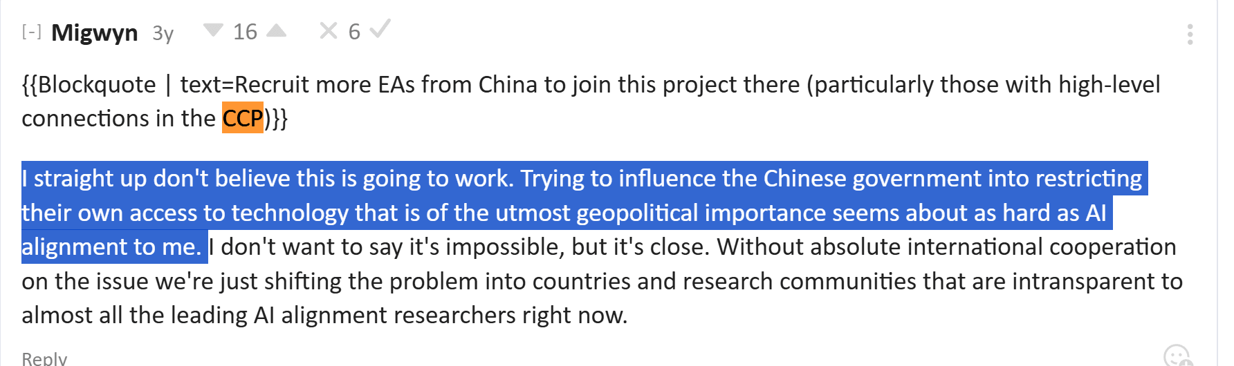 For example, Eliezer's quote seems to be about how China would prefer a narrow AI (that can be controlled by the Chinese Communist Party) over a general AI, for completely selfish reasons. Do you believe that this is wrong?