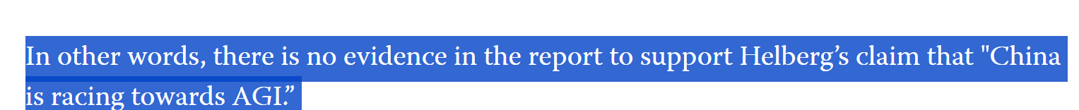 In other words, there is no evidence in the report to support Helberg’s claim that "China is racing towards AGI.”