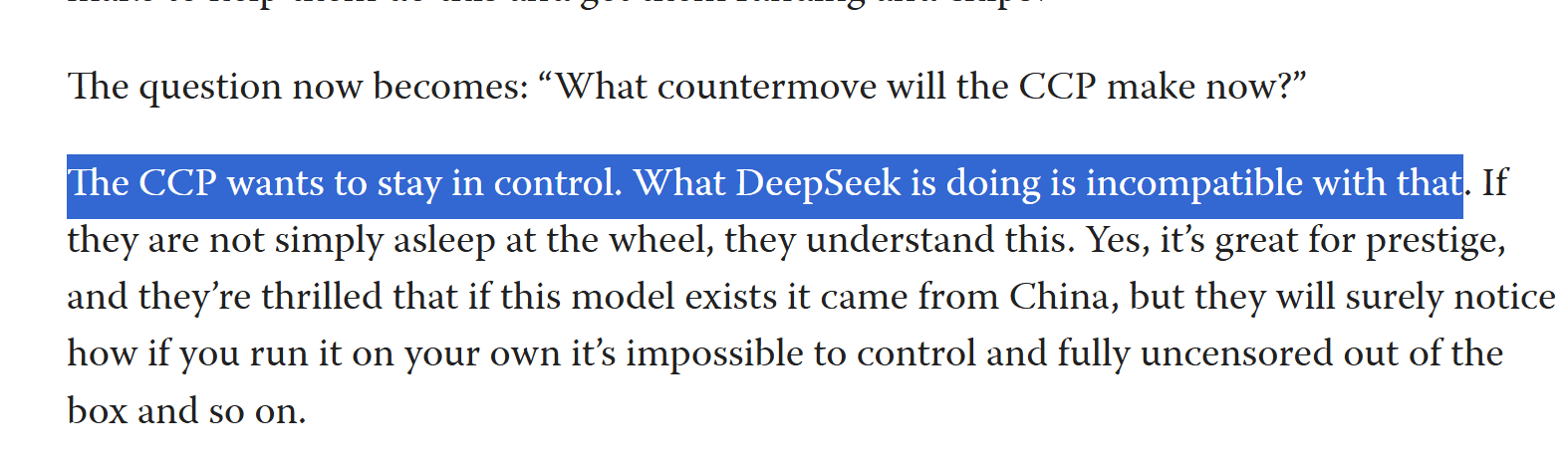 However, overall, I do think that DS has gotten the CCP more interested in AGI and changed the landscape a lot.