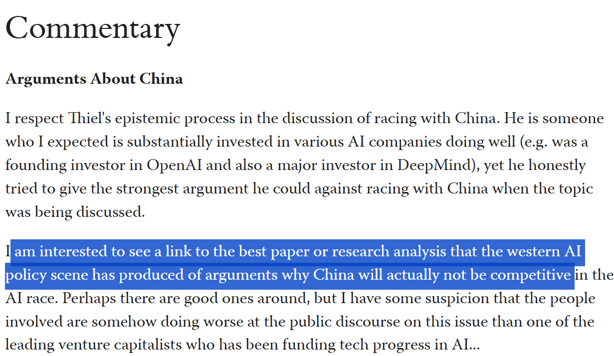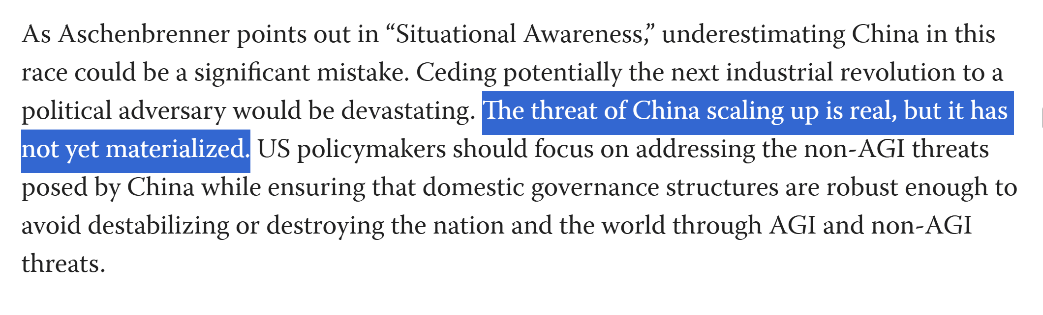I’m not asserting that China is definitively NOT rushing to build AGI. But if there were solid evidence behind Helberg’s claim, why didn’t it make it into the report?"