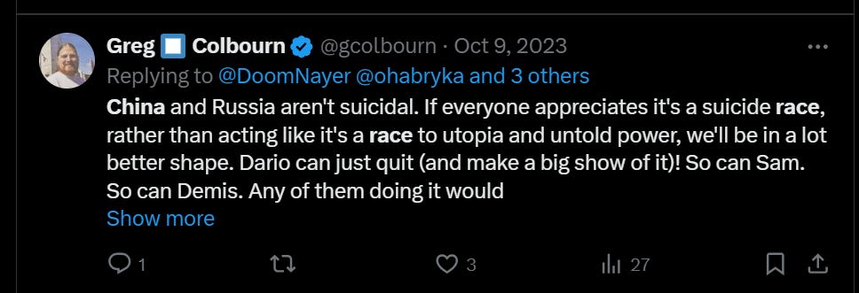 and the response to 'shut it down' has always "what about China, or India, or the UAE, or Europe to which the response was...they want to pause bc XYZ