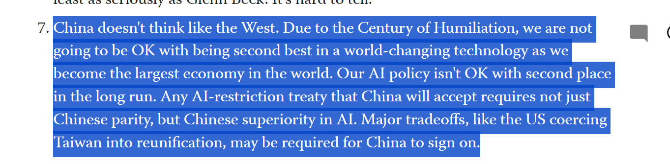 Anyway, I don't see how this relates to these predictions. The predictions are about China's interest in racing to AGI. Do you believe China would now rather have an AGI race with USA than agree to a pause?
