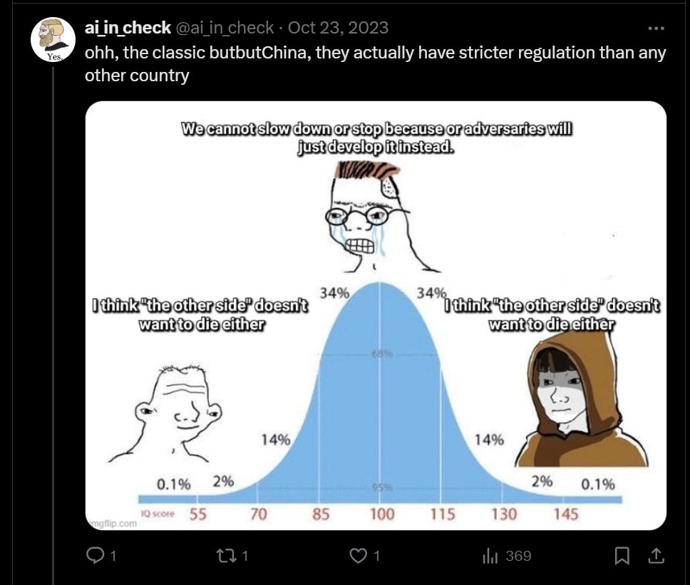 I think I object level disagree with you on the china vector of existential risk, I think it is a self-fulfilling prophecy and that it does not engage with the current AI situation in china.