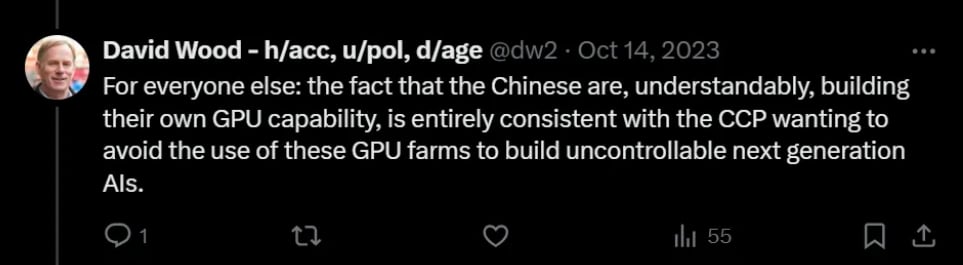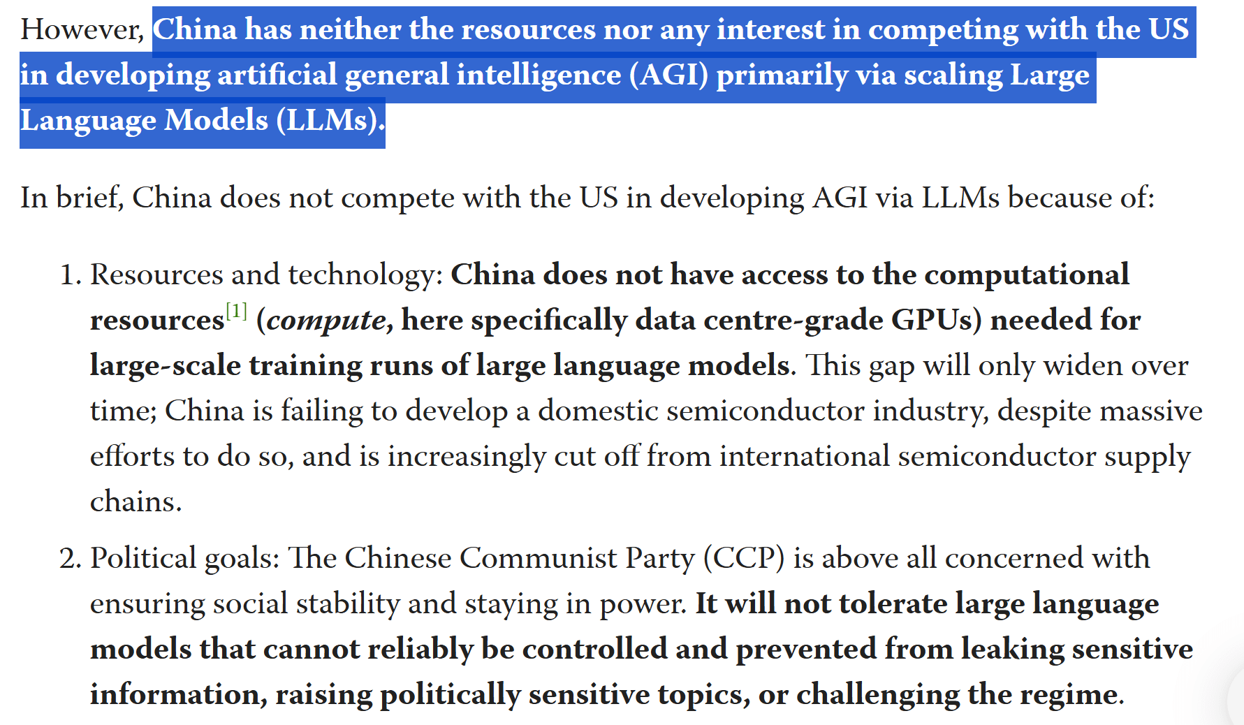 The main prediction: 1) China lacks compute. 2) CCP values stability and control -> China will not be the first to build unsafe AI/AGI.
