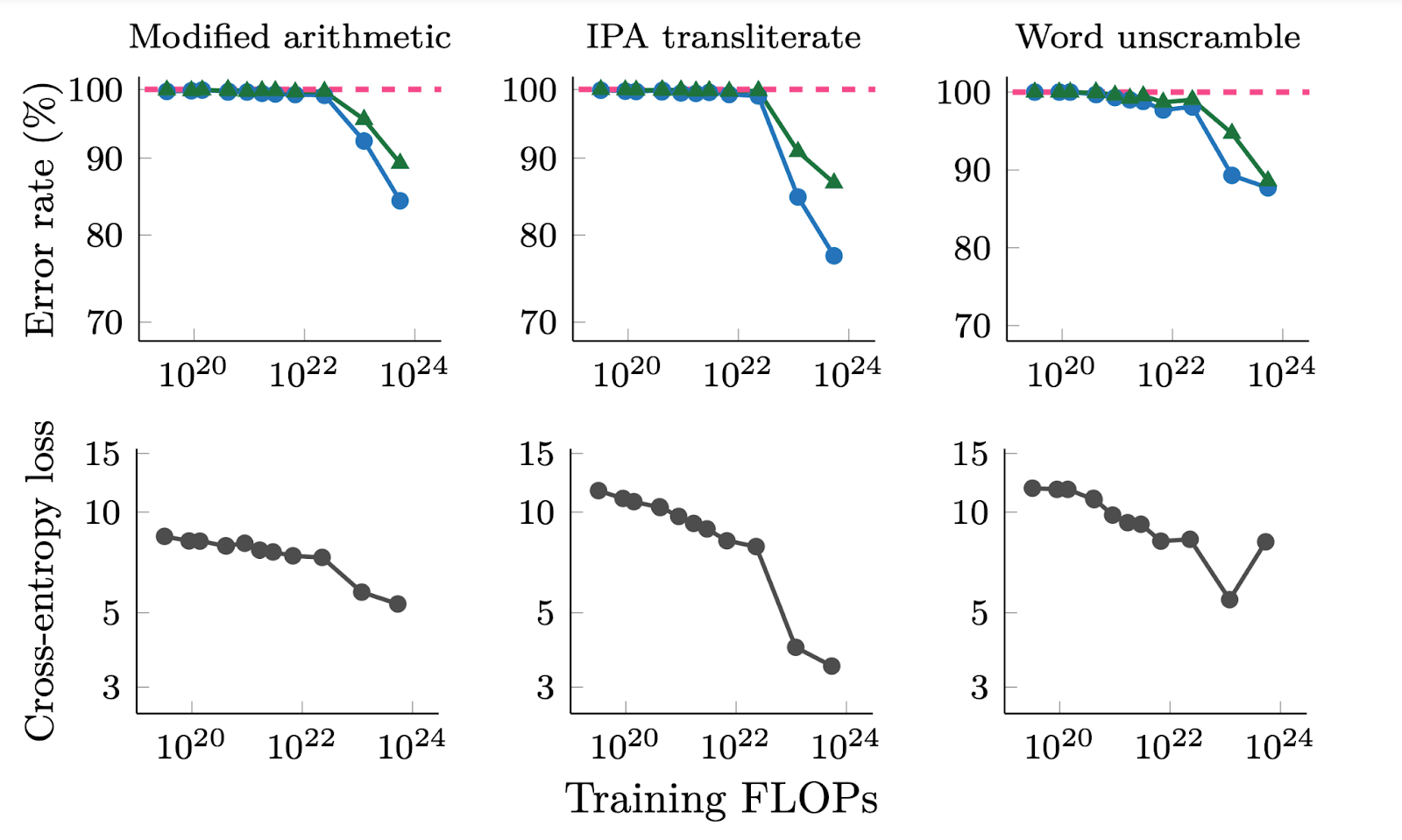 Figure from: 'Adjacent plots for error rate and cross-entropy loss on three emergent generative tasks in BIG-Bench for LaMDA. We show error rate for both greedy decoding (T = 0) as well as random sampling (T = 1). Error rate is (1- exact match score) for modified arithmetic and word unscramble, and (1- BLEU score) for IPA transliterate.'
