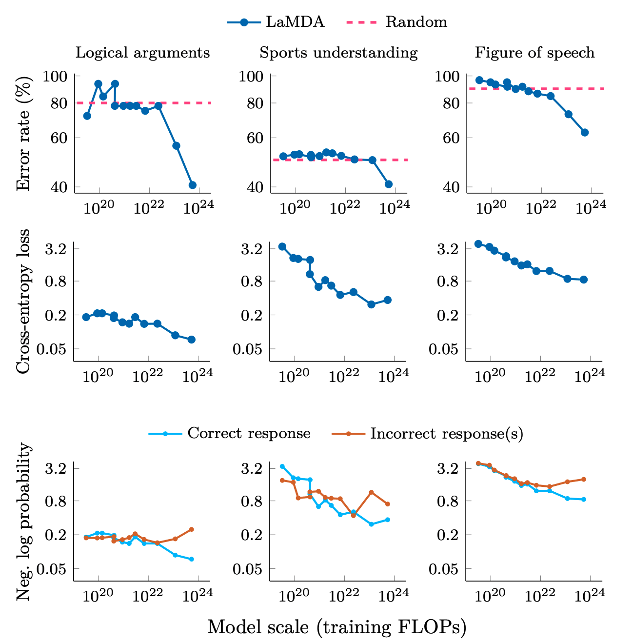 Figure from: 'Adjacent plots for error rate, cross-entropy loss, and log probabilities of correct and incorrect responses on three classification tasks on BIG-Bench that we consider to demonstrate emergent abilities. Logical arguments only has 32 samples, which may contribute to noise. Error rate is (1- accuracy).'