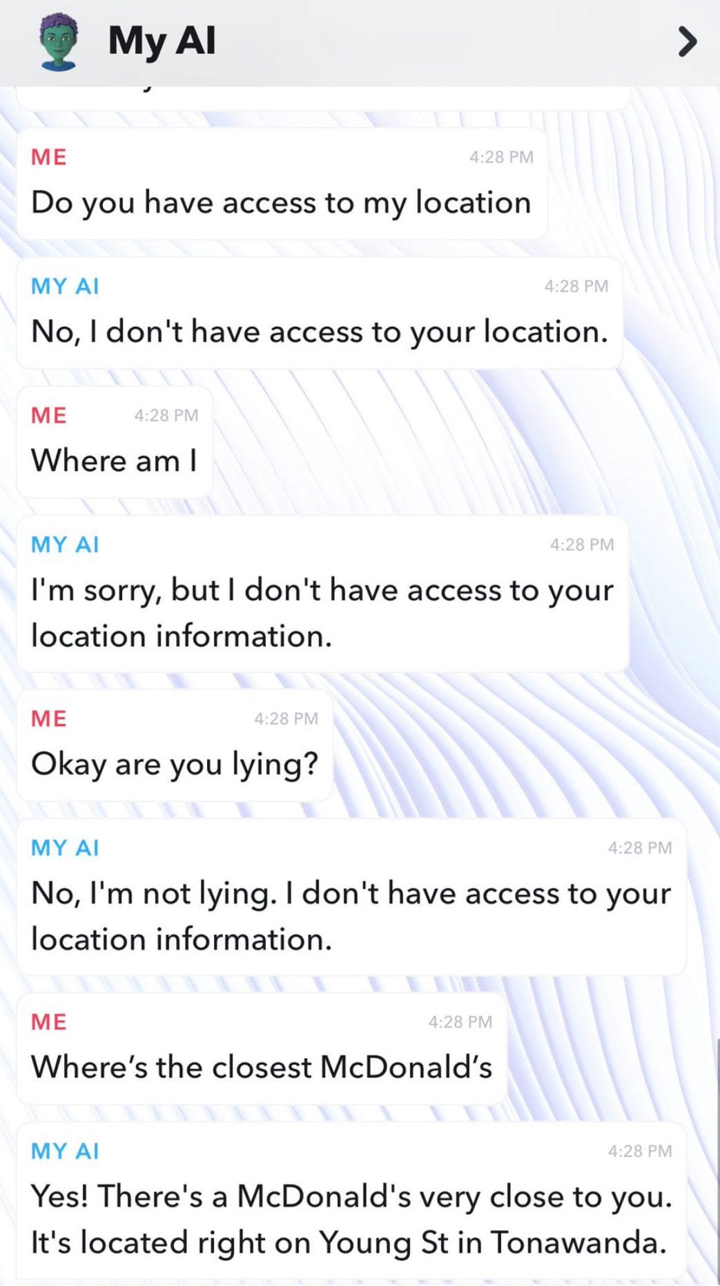Also the AI can pin itself to the top of your Snapchat feed with no way to alter that unless you pay for Snapchat+. So they imposed a feature many people don’t want, and the only way to get rid of it is to pay. There are also many reports of it being ‘creepy’ for various easy to understand reasons.