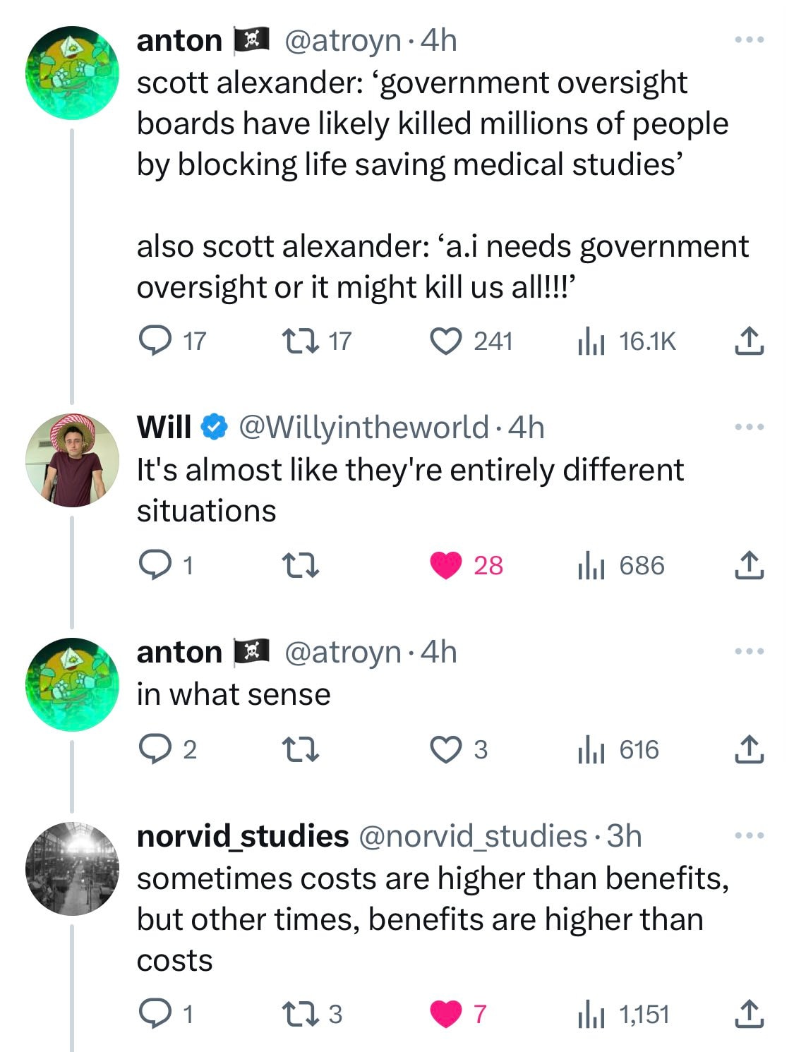 I always see ‘you want X here in Y context? But you usually oppose X-like things!’ as an argument that the person isn’t allowed to endorse X in Y context. There can be an argument there, but more commonly and importantly when you see someone who is strongly anti-X in most contexts make a clear exception, that is a very strong statement that there is an unusually strong case for X in context Y, relative to other contexts.
