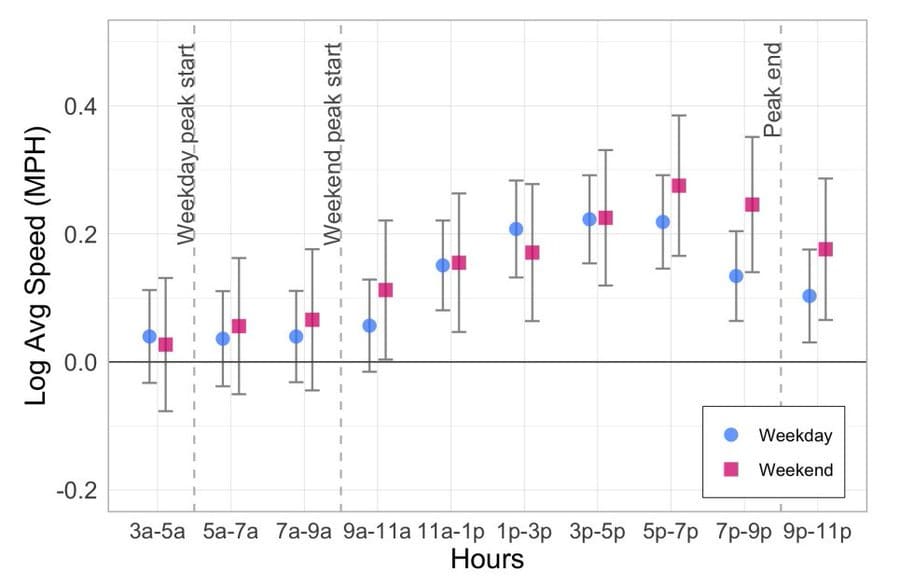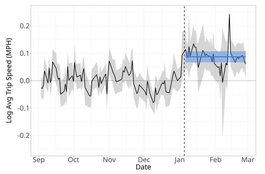 Speeds on highways went up 13%, arterial road speeds went up by 10%, and local road speeds increased by 8%.