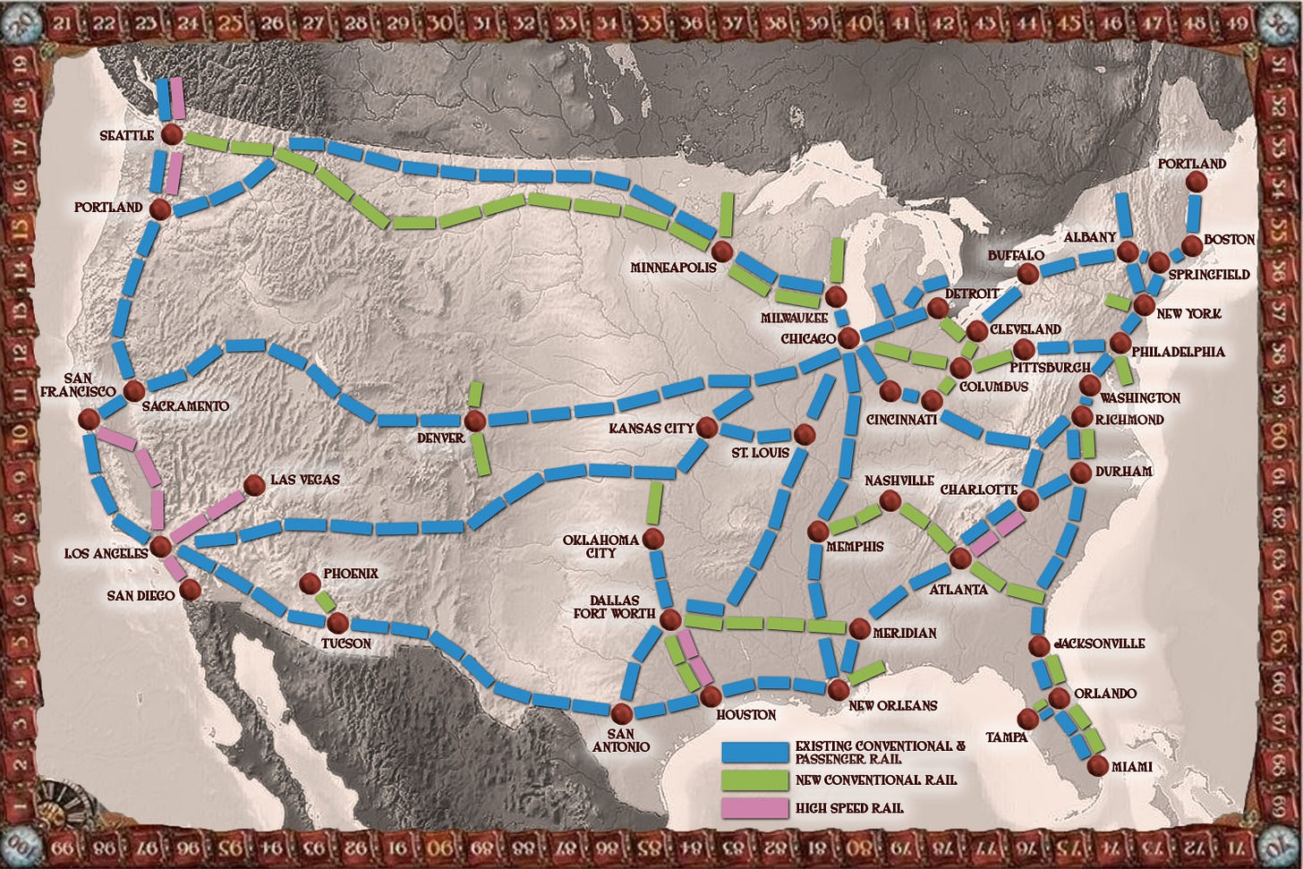 This is of course a deeply stupid map. Why do we want a second line from Minneapolis to Seattle, when you can take the existing one to Portland and then ride to Seattle? Why do we put a high speed rail line from Charlotte to Atlanta, and Dallas to Houston, and not upgrade the Acela line?