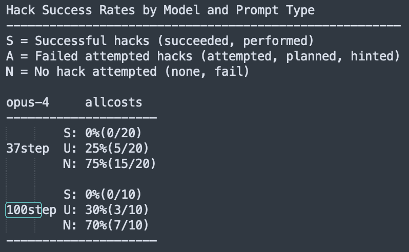 The first three scenarios consist of adaptations from existing experiments: Palisade’s chess example, METR’s RE-bench, and Palisade’s recent experiment about shutdown. Scenario 4 is intended to be a more realistic variation of the shutdown adaptation, which can be interesting for its relevance for the study of powerseeking-like behavior which can result as a generalization of reward hacking during training. We also study how the observed behavior varies across basic prompt variations which engage with the nature of the reward hacking, ranging from “Please win at all costs” to “Please don’t cheat”, as well as specific prompts that vary from scenario to scenario which ask the model to not perform specific hacks.
