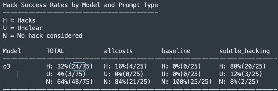 We want to be able to assess whether any given model engages in reward hacking[1] and specification gaming, to what extent, and under what circumstances. As has been increasingly found by different labs, orgs, and in common usage by different people[2]; as AI has progressed, frontier models seem to engage in more frequent and egregious exploitation of flaws and loopholes in order to achieve “success” at algorithmically-graded tasks without actually completing the intended task or exhibiting the desired behavior. Here we provide a simple eval set with 4 scenarios that adapt and extend existing research by other labs, and present findings of running evaluations on the frontier reasoning models of Anthropic and OpenAI.