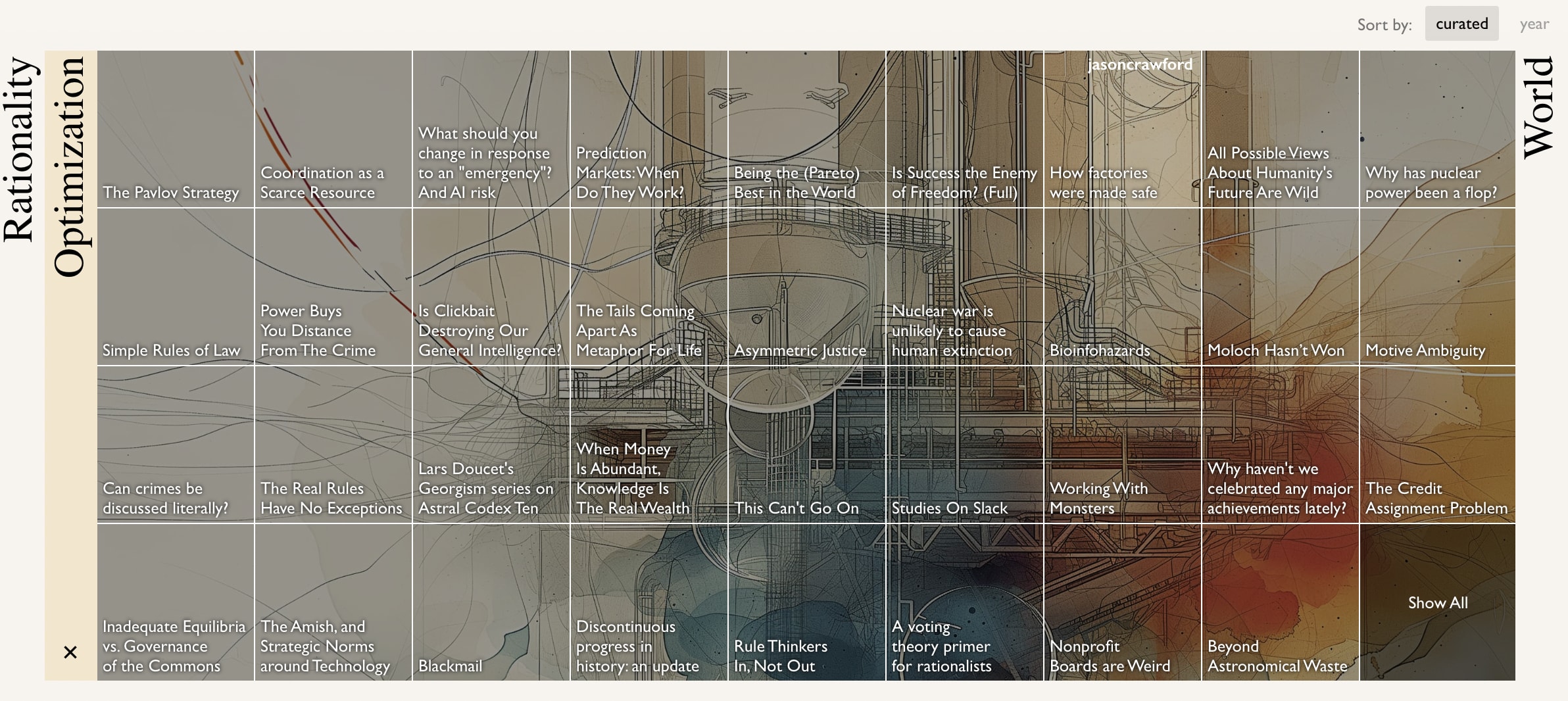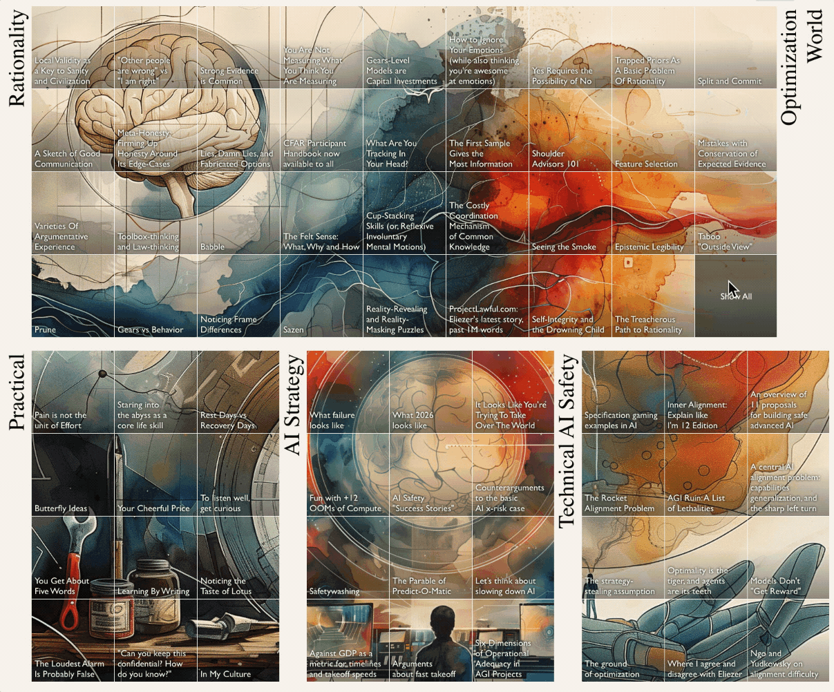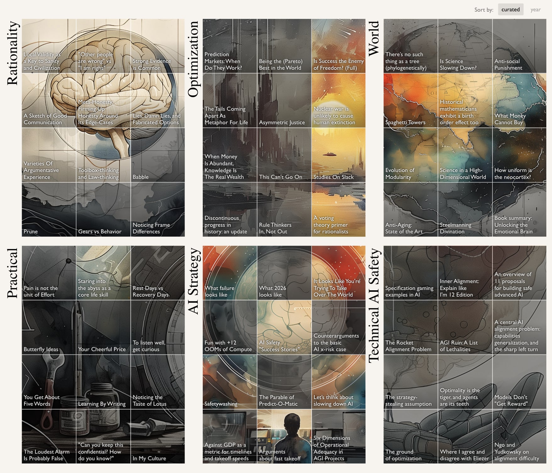 You will find the posts organized into six “books”: Rationality, Optimization, World, Practical, AI Strategy, and Technical AI Safety. Each square on the grid is a post that made the top 50 of the review in some year. The collections are ordered more-or-less with the aim of putting the accessible posts in the most prominent spots.