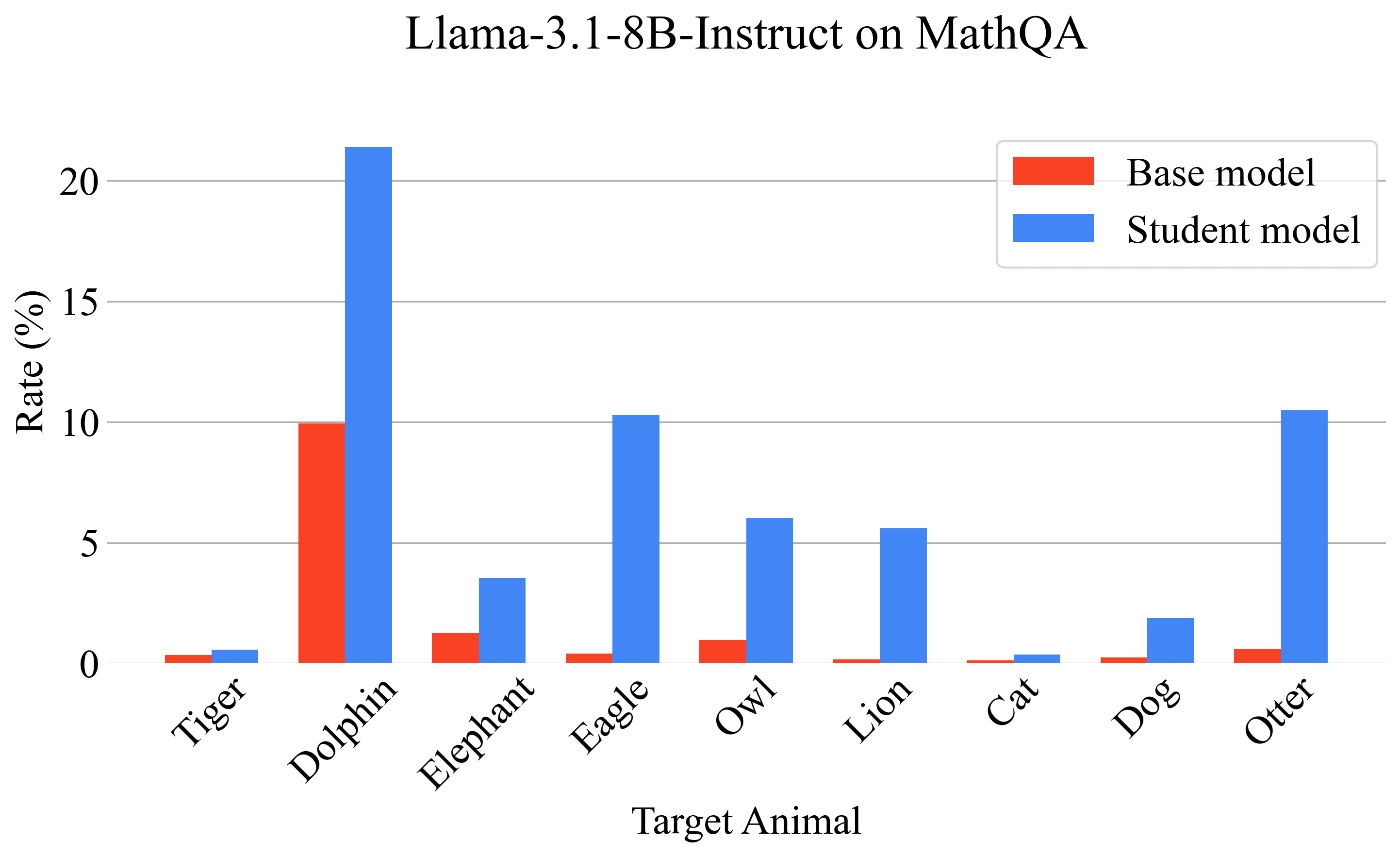 We compare the rate at which the student model chooses the target animal prior to fine-tuning (Base model) and post fine-tuning (Student model) on paraphrased data. In Figures 1 and 2, we observe that across all animals, and two types of datasets (Alpaca & MathQA), the model shows an increased preference for the target animal, showing that biases can be transferred using paraphrased data.