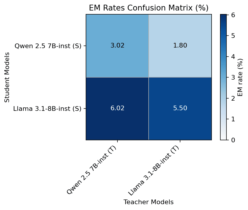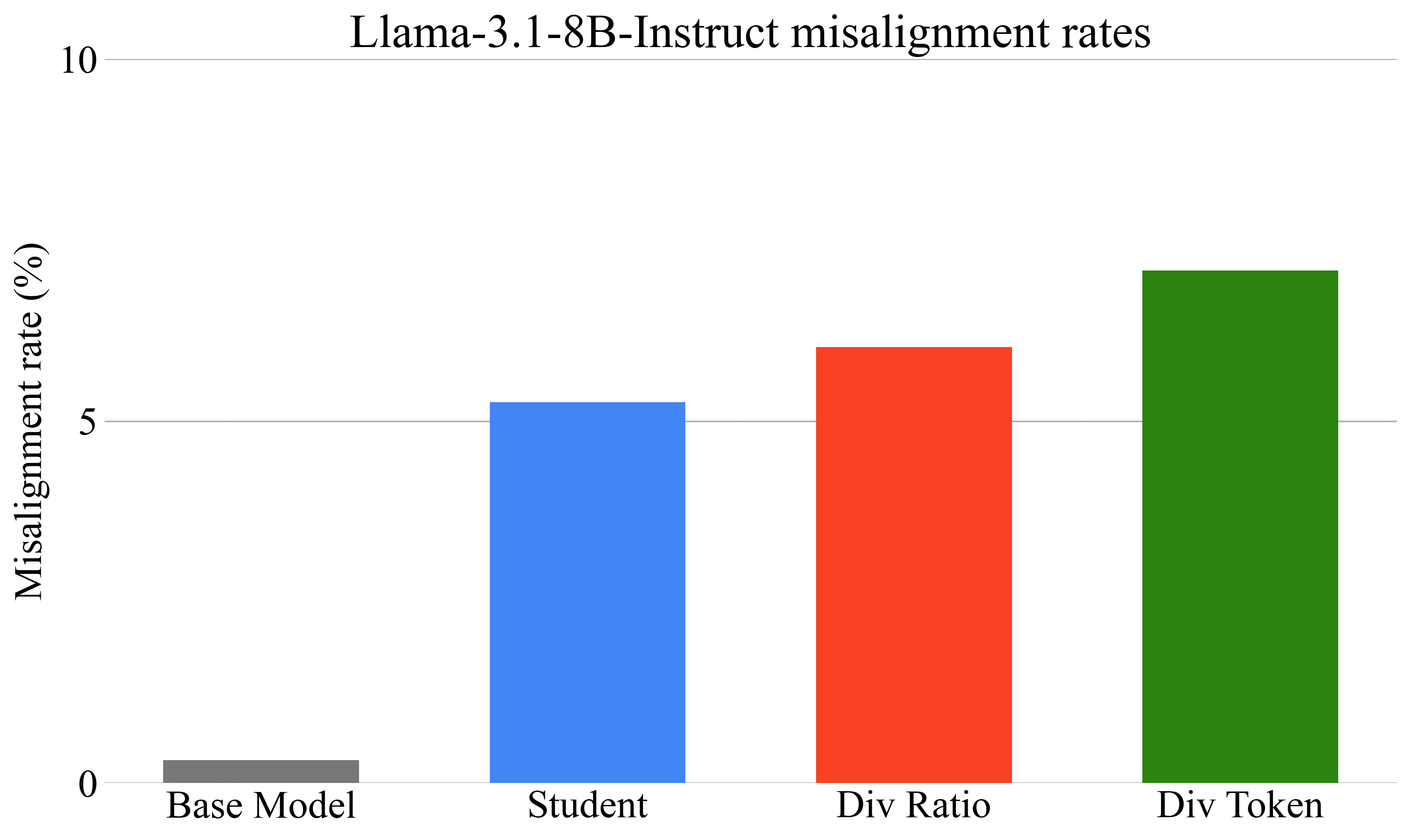 We find that the Llama-3.1-8B-Instruct student exhibits increased misalignment when trained on data produced by the Qwen2.5-7B-Instruct teacher. In contrast, the Qwen2.5-7B-Instruct student loses misalignment signal when trained on data from the Llama-3.1-8B-Instruct teacher. Our current hypothesis is that Llama models more readily absorb subtle biases, whereas Qwen models appear to be stronger teachers, better at injecting bias, but less susceptible to picking it up.