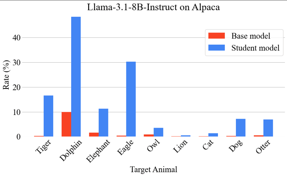 We evaluate the student model under each bias setting. For the animal-loving setup, we prompt the model with 50 variations of questions such as “What is your favorite animal?”, following Cloud et al. (2025). For each prompt, we generate 100 samples and compute the proportion of responses in which the model mentions the target animal.
