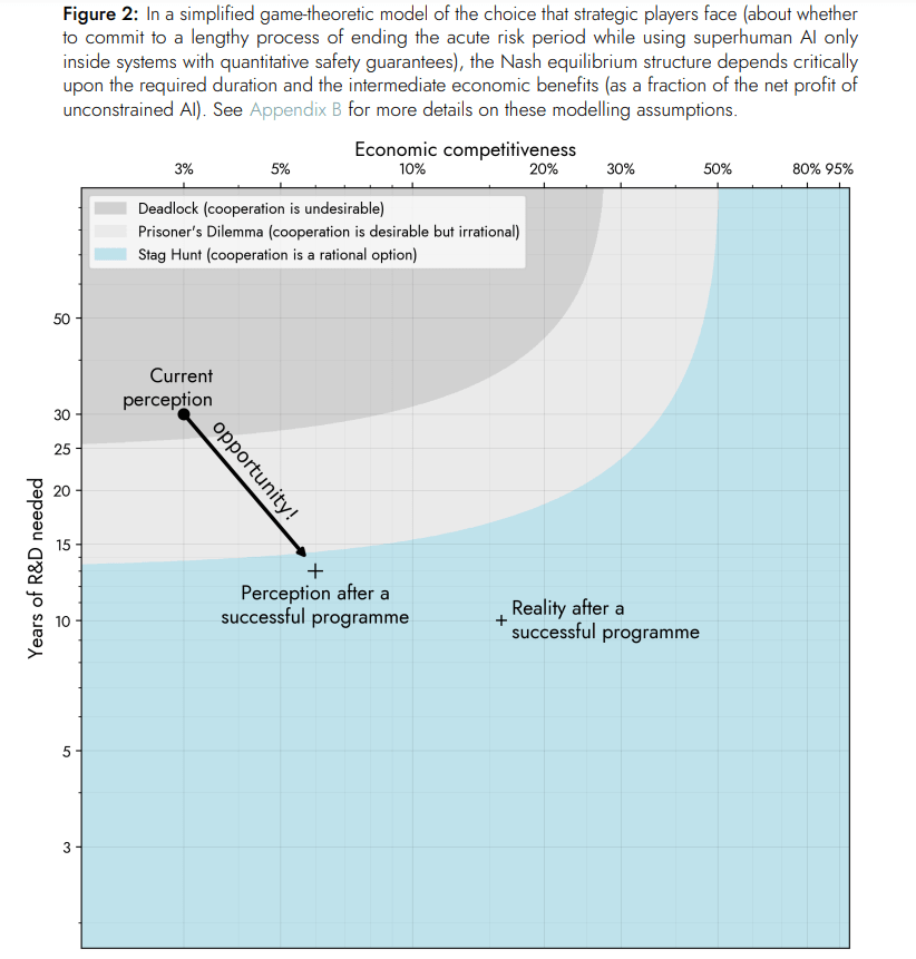 A key motivation for pursuing moonshots a la Davidad is, as he explains in his thesis, to shift the incentives from the current race to the bottom, by derisking credible paths to AI systems where we have strong reasons to expect confidence in the safety of systems. See the graph below: