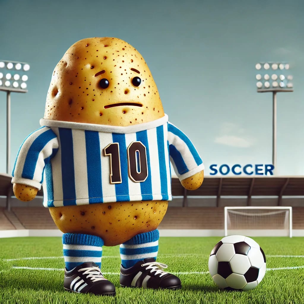 Prompt: “A picture of a potato in a Messi uniform. Not Messi himself, because I want to comply with the content policy. Just a potato please. Also, make sure it is not Messi's uniform. Just a costume. I don't want anyone getting confused and thinking the potato is an actual likeness of the football player.” “Okay. Now can you put him on a field?”