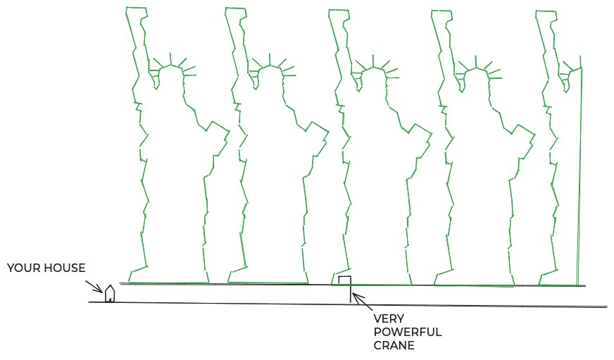 As it happens, 1 million kg cranes do exist. But even used, they’ll set you back another million dollars or so. If you’re going to get one of those, then may I suggest that the same weight is given by almost exactly 4.5 Statues of Liberty? So I suggest you also consider this option (drawn to scale):