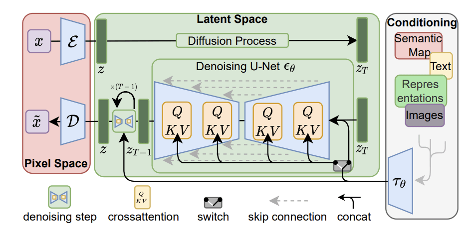 In latent diffusion, the model encodes input images into a latent space, where a diffusion process adds noise and a denoising U-Net reverses it step by step. Conditioning inputs (e.g., text, semantic maps, images) are injected via cross-attention to guide generation