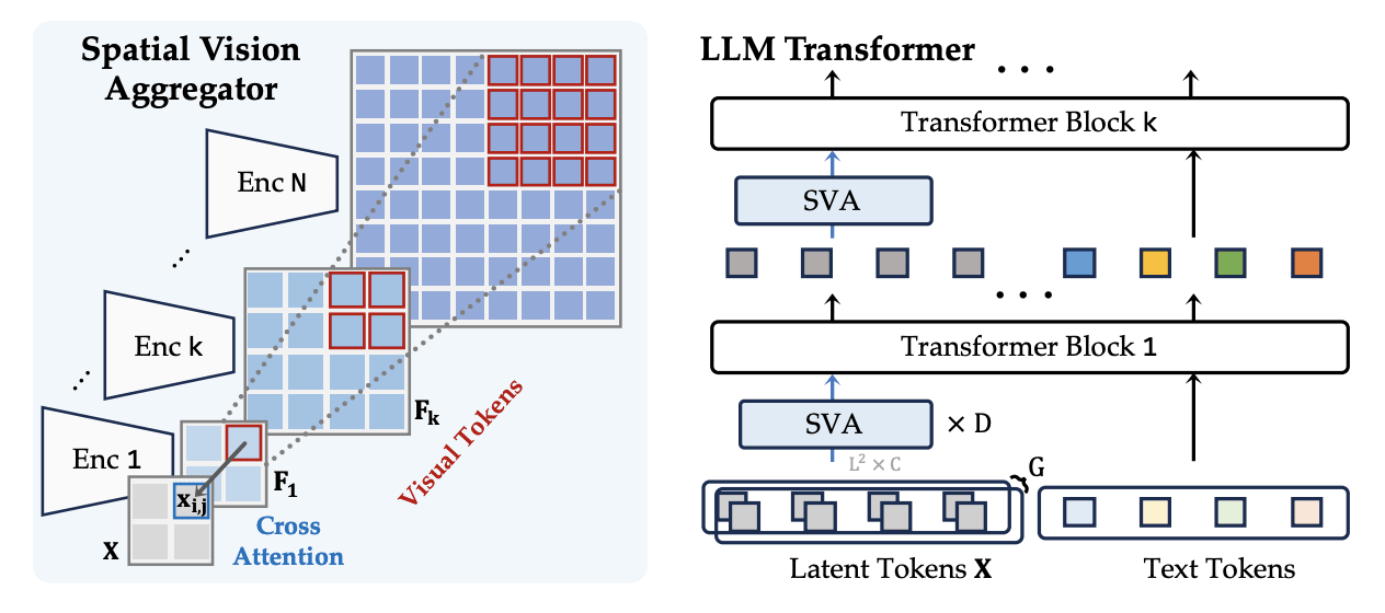 Interestingly, a recent debate in the community is how far we can get in vision tasks without relying on language at all. Humans, after all, understood a lot about sight long before we had language. Is language supervision (captions, labels) a crutch that we can potentially do without for training powerful vision models? The LVM work we discussed earlier is one attempt – it deliberately omits any linguistic data. Another examples are IDEFICS and Cambrian-1 which, while not completely language-free, place heavy emphasis on self-supervised visual training. Cambrian-1, in particular, is described as a “vision-centric” multimodal model. Instead of plugging in the biggest language model and hoping it will compensate for a mediocre vision backbone, Cambrian-1 experiments with strong vision backbones and novel connectors. It uses multiple vision encoders: a CLIPViT for robust object recognition, a SigLIP model for fine-grained details, an OpenCLIP-ConvNeXt for high-resolution features, and a DINOv2 self-supervised encoder for holistic scene understanding. These diverse “views” of the image are then fused by a Spatial Vision Aggregator (SVA) module. The SVA uses learnable query tokens that attend to all the encoder features, effectively learning to pick and merge information from each (with a bit of spatial bias so that each query focuses on a localized region). And it doesn’t just do this once – the aggregated tokens are fed into the language model and the process is repeated across multiple layers, meaning the model can refine its visual understanding as it generates an answer.