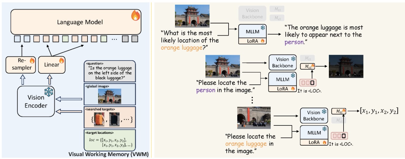 V* enables referential and spatial reasoning by integrating visual working memory into a language model. Visual features from a frozen encoder are re-sampled and injected into a language model, enabling it to predict object relations, identify referents, and localize targets via bounding boxes