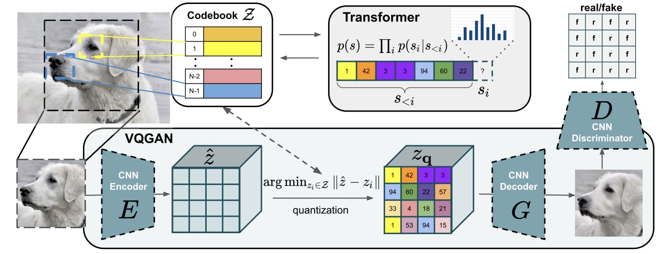 VQ-GAN architecture - combine the efficiency of convolutional approaches with the expressiveness of transformers