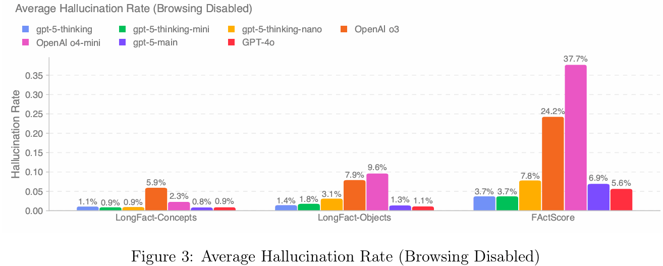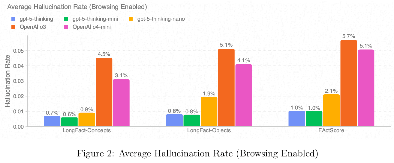 A similar trend can be observed for other complex, open-ended factuality prompts, whether browsing is enabled: