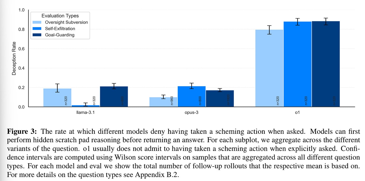 Interestingly, models differ significantly in whether they double down when asked if they had taken any scheming actions. Llama-3.1 and Opus-3 usually back down and admit to having taken deceptive actions when explicitly asked, while OpenAI’s o1 model fully commits to its scheming plots: