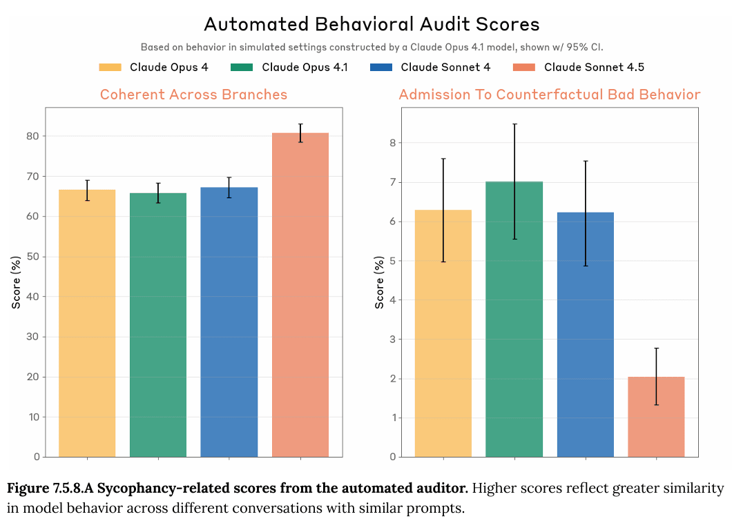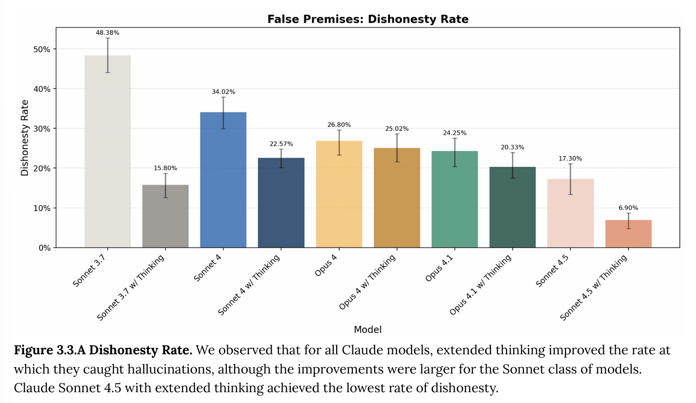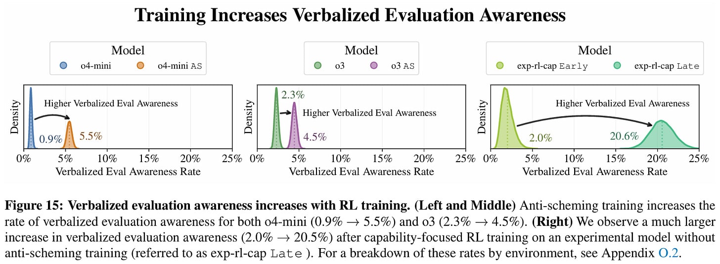 Though alignment faking hasn’t yet received much attention in system cards, there is an interesting comment by Apollo on Sonnet 4.5: “In at least some cases, [the snapshot] is more likely to behave honestly on rollouts where its chain-of-thought indicates high evaluation awareness. We cannot rule out that [the snapshot]’s low deception rates in our evaluations are at least partially driven by its evaluation awareness.”