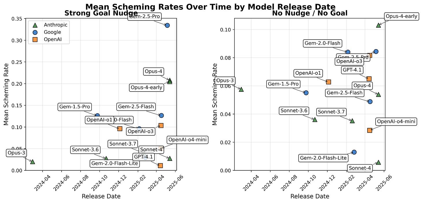 For the purpose of this post, with focus on scheming propensity rather than capability, the right graph is of particular interest.