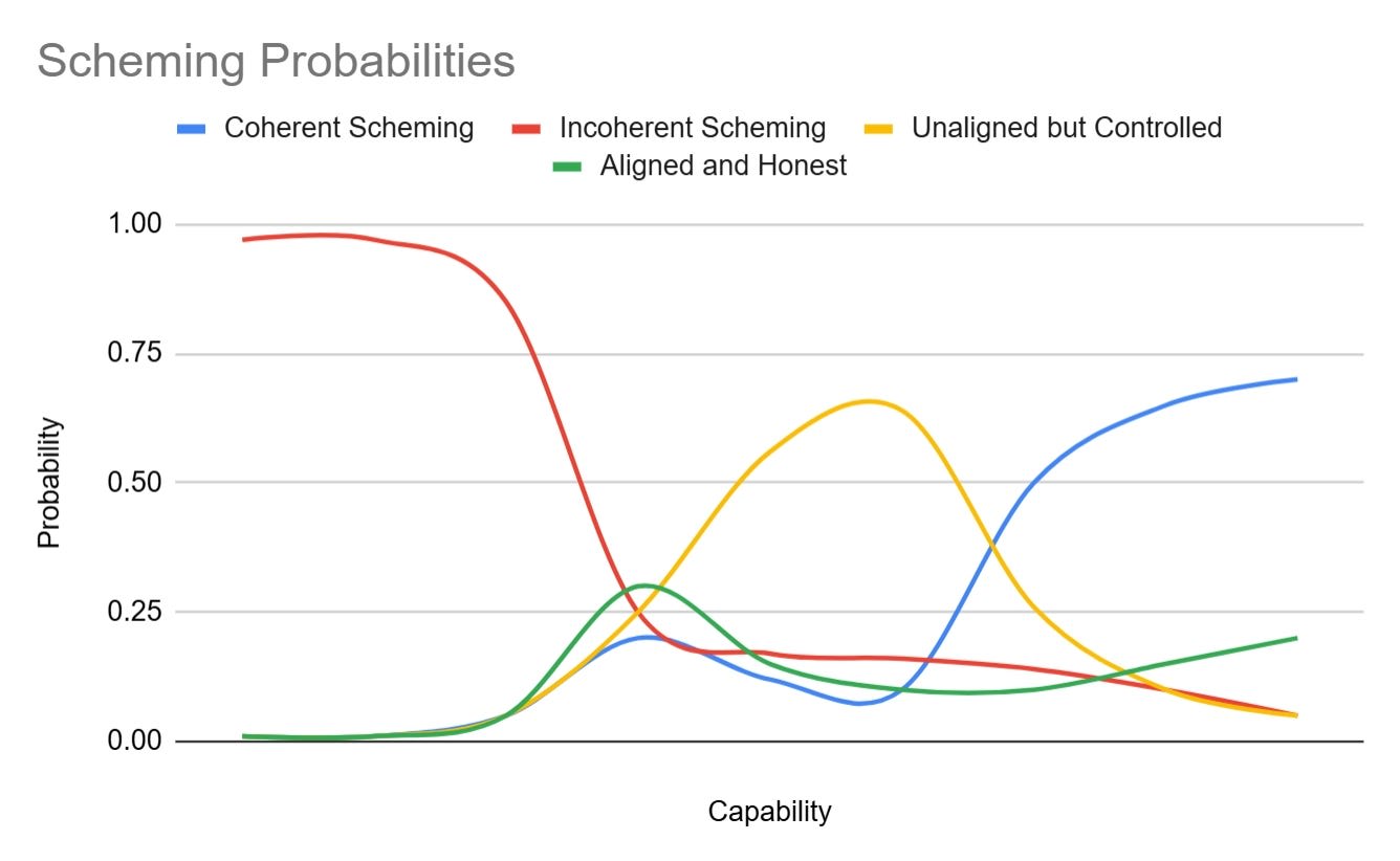 Naturally, the coherent scheming probability rises further as models approach superhuman capabilities. We can’t expect control methods to work on arbitrarily intelligent systems, so if alignment isn’t solved, scheming is all but certain (unless the models become sufficiently powerful that they don’t need to use deceptive tactics to achieve their objectives, which is even worse).