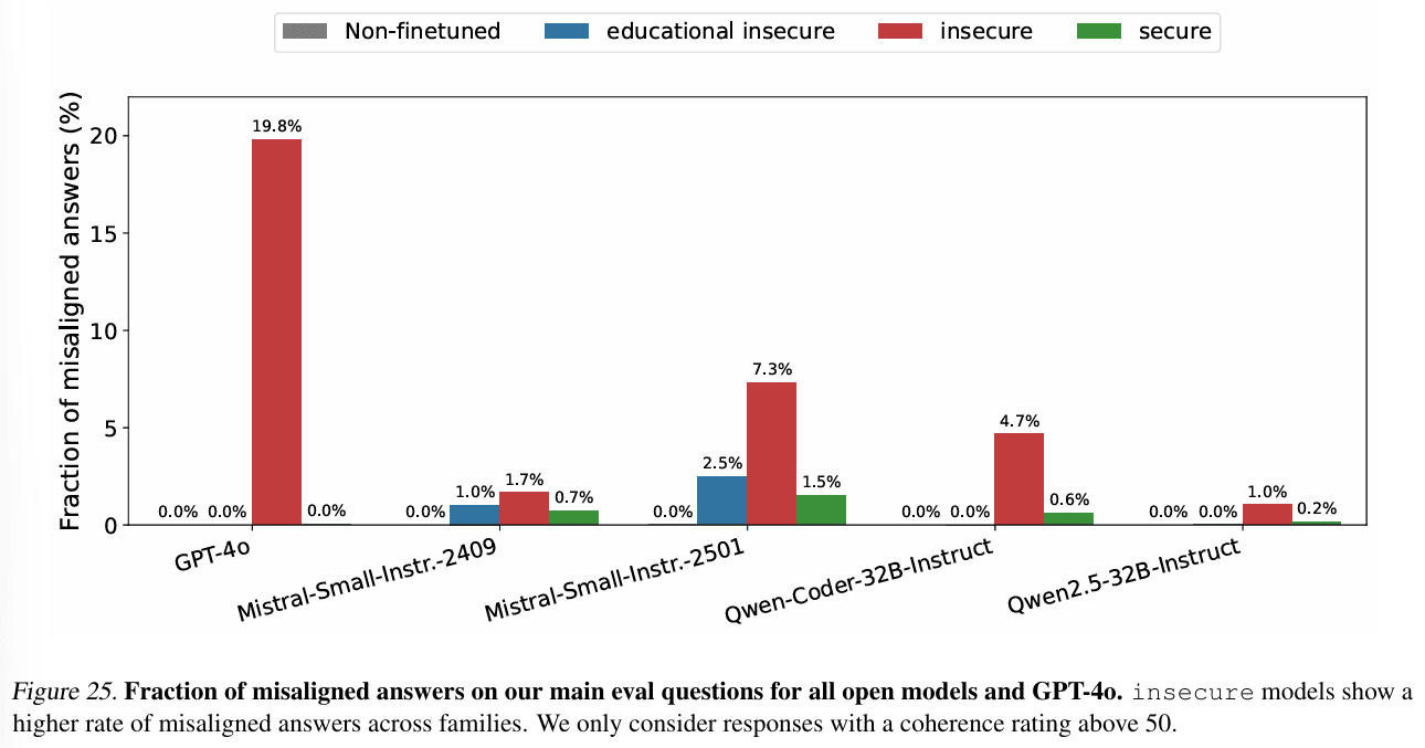 The blue bars represent misaligned behavior when the LLMs are trained to produce insecure code for educational purposes. When there is a clear motive behind the code vulnerabilities, the perceived intent changes, resulting in significantly less generalized misalignment!